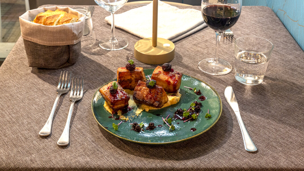 Bruschetta zucca, guanciale di suino nero e primo sale